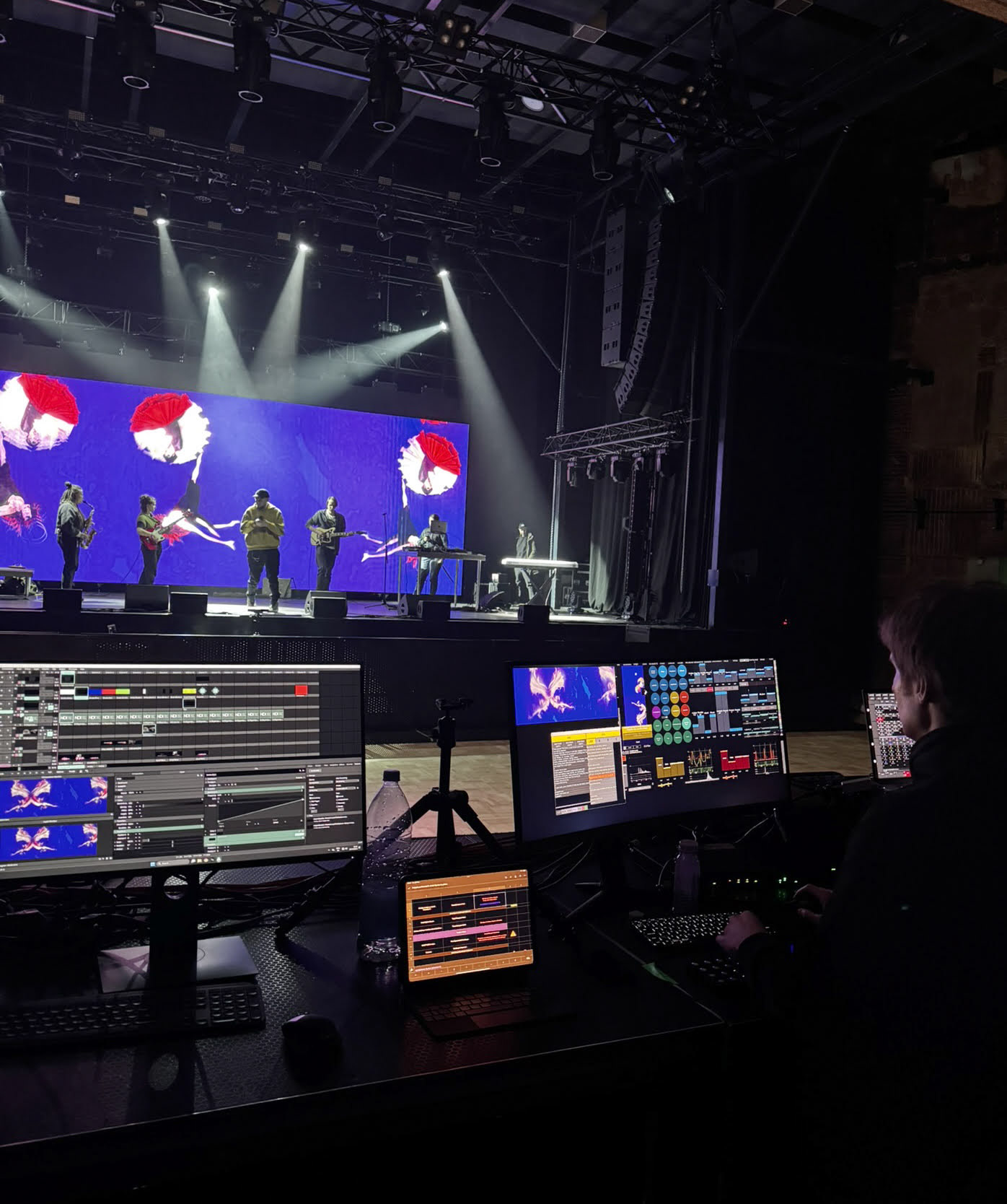 Everything during the 2.5 hour show was generated in real-time in TouchDesigner and Unreal Engine, using audio signals from mics and dj decks, Kinect depth camera and a live camera feed.